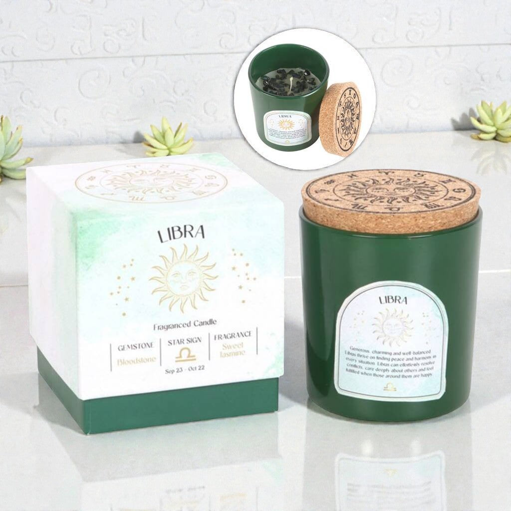 Im Wachs liegen echte Blutstein-Edelsteine, die kraftvolle und ausgleichende Energie symbolisieren – genau richtig für ein Luftzeichen mit Sinn für Fairness.