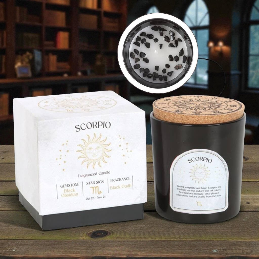 Im Wachs liegen echte schwarze Obsidian-Edelsteine, die optisch wie energetisch perfekt zum Skorpion passen.
